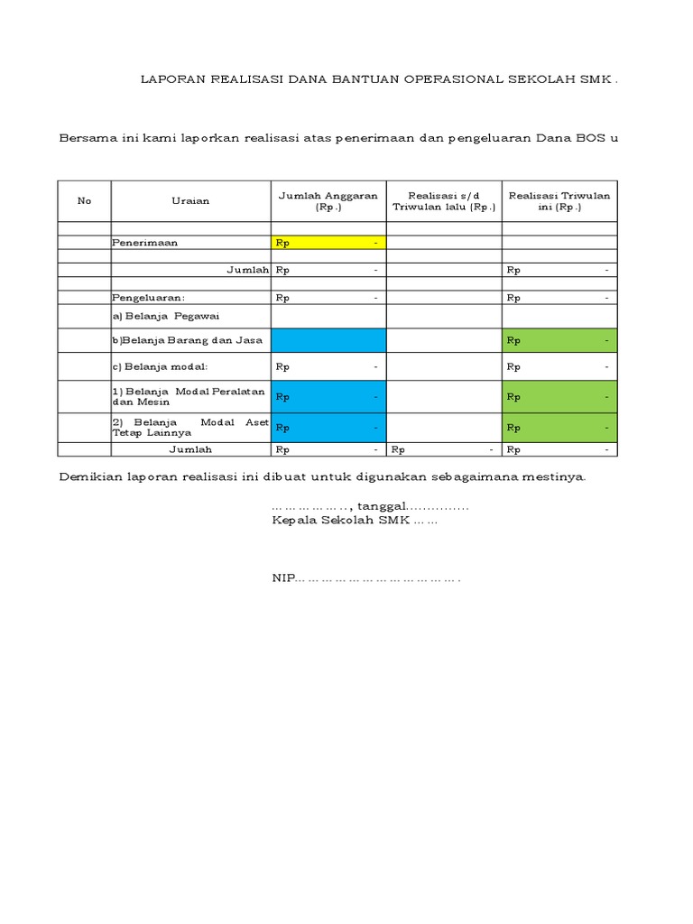 Contoh belanja modal bos oleh bu popi diposting pada juli 13 format terbaru laporan realisasi bos tahun. Jul 13, 2019 · 3. Kolom 1 diisi dengan tanggal transaksi belanja pegawai, barang dan jasa serta modal. Belanja modal aset tetap lainnya 3 nama barang yang dibeli Rekapan 4 jenis belanja dana bos 2019 sesuai dengan surat edaran mendagri , format rekapan jenis belanja dan bos 2019 silakan klik disini 2014 , bahan ajar , berita , serba serbi Nov 06, 2013 · format pelaporan belanja modal dan barang habis pakai written by upt dikbudpora kecamatan purworejo on wednesday, november 6, 2013 | 7:14 am bapak ibu bendahara bos pusat, pendampingan, dan pengembangan sd inti, kami sampaikan dengan hormat format pelaporan belanja modal dan barang habis pakai tahun. Kolom 4 diisi dengan nominal realisasi. May 02, 2020 · laporan realisasi anggaran lra adalah sebuah format laporan berdasarkan jenis belanja menggunakan kode rekening sesuai permendagri. Contoh format rka bos 2017 august 2020 0. Kolom keterangan disi apa yang perlu diterangkan, disini diisi sumber danyany bisam bos pusat 2019, sem 1 4. Bagaimana untuk melaporkan belanja modal dan pengusulan barang? Contoh belanja modal pada bos. Jumlah total haruslah sesuai dengan laporan keuangan tentang jumlah belanja modal.